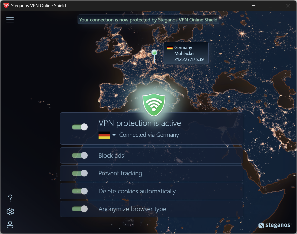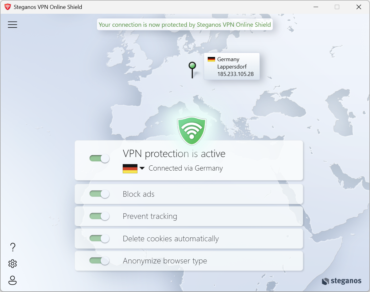 Unlike other programs, Steganos VPN Online Shield protects your IP address not only in the browser, but also for downloaders.