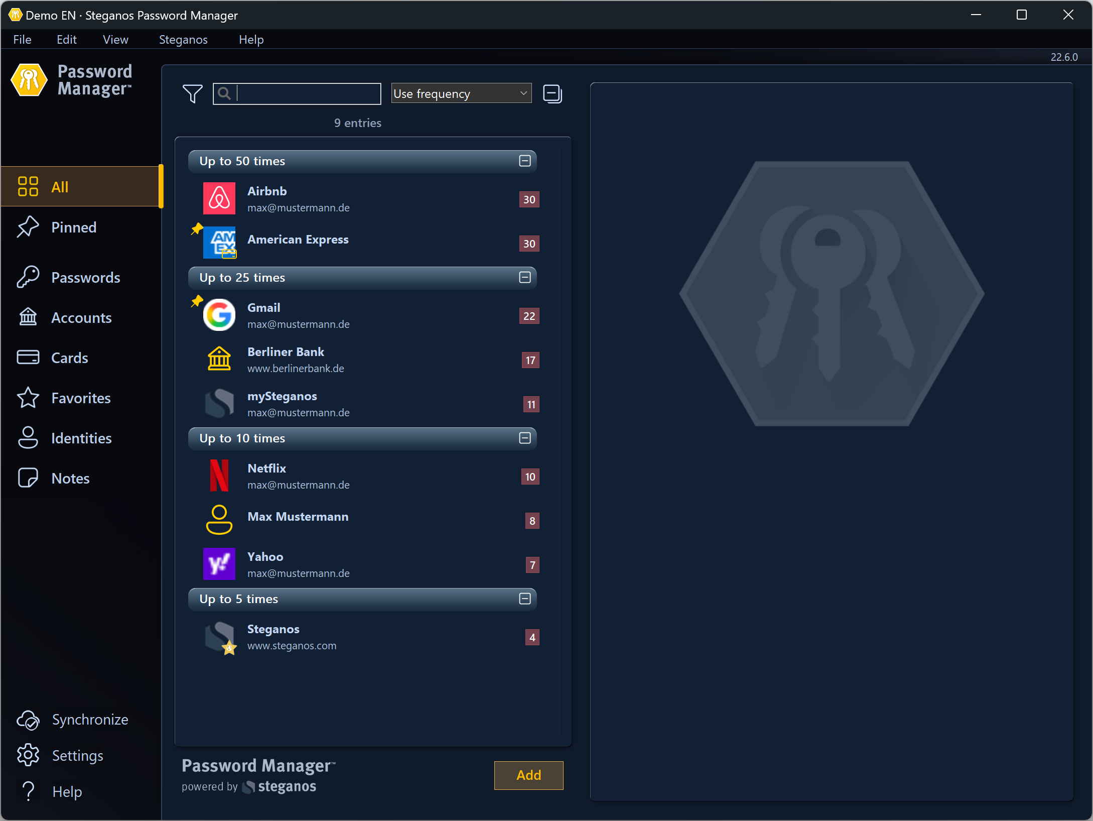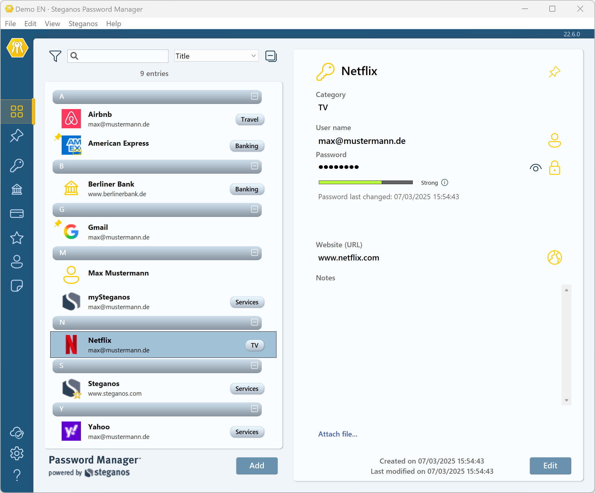 The password manager offers you an optimal and securely encrypted overview of all login data. It lets you create new, strong passwords at any time. An all-in-one solution that creates an overview and at the same time offers maximum security for your personal data, payment details and documents. Whether on your PC, smartphone or optionally in the cloud.